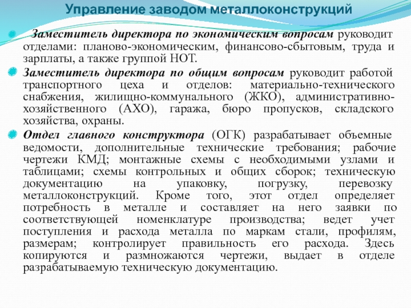 Заместитель директора по общим вопросам руководит работой транспортного цеха и отделов: материально-технического снабжения, жилищно-коммунального (ЖКО), административно-хозяйственного (АХО), гаража, бюро пропусков, складского хозяйства, охраны.
