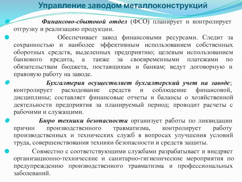 Бухгалтерия осуществляет бухгалтерский учет на заводе; контролирует расходование средств и соблюдение финансовой, дисциплины; составляет финансовые отчеты и балансы о хозяйственной деятельности предприятия за планируемый период; проводит расчеты с рабочими и служащими.