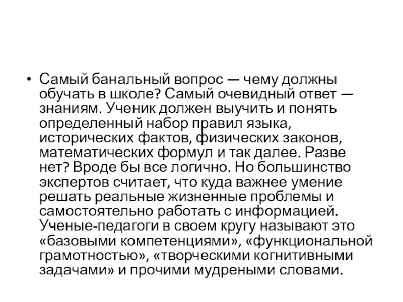 Слайд 7Самый банальный вопрос — чему должны обучать в школе? Самый очевидный