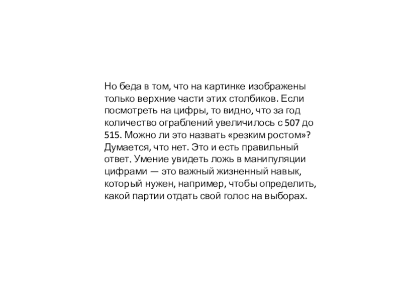 за год количество ограблений увеличилось с 507 до 515. Можно ли это назвать «резким ростом»? Думается, что нет. Это и есть правильный ответ. Умение увидеть ложь в манипуляции цифрами — это важный жизненный навык, который нужен, например, чтобы определить, какой партии отдать свой голос на выборах.