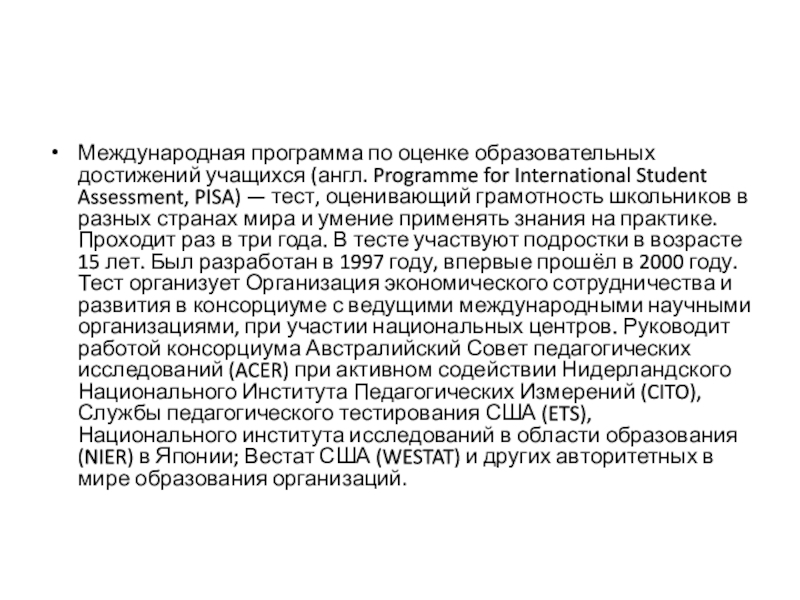 Слайд 1Международная программа оценки учебных достижений 15-летних учащихся (англ. Programme for International