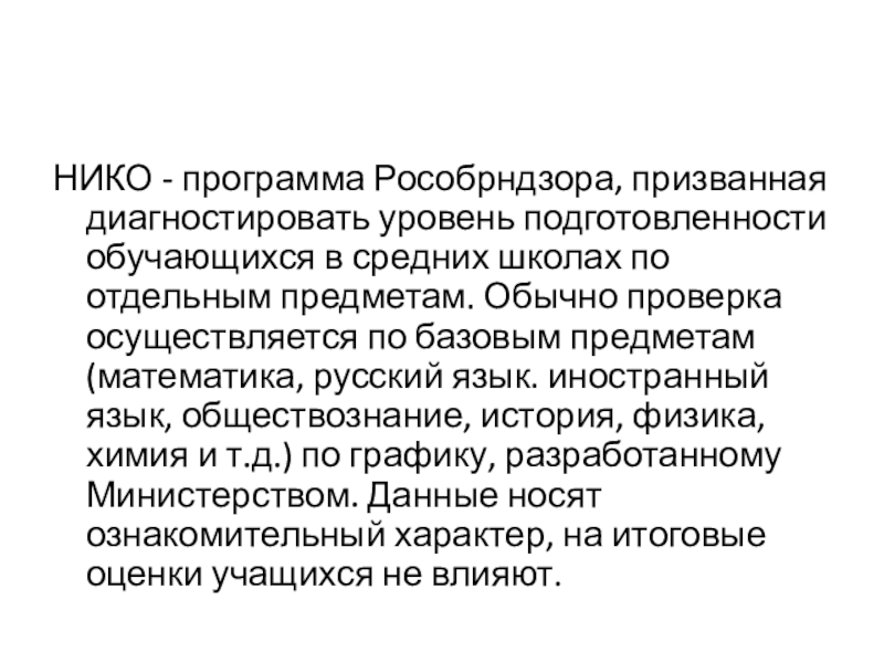 Слайд 13НИКО - программа Рособрндзора, призванная диагностировать уровень подготовленности обучающихся в