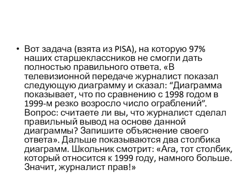 показал следующую диаграмму и сказал: “Диаграмма показывает, что по сравнению с 1998 годом в 1999-м резко возросло число ограблений”. Вопрос: считаете ли вы, что журналист сделал правильный вывод на основе данной диаграммы? Запишите объяснение своего ответа». Дальше показываются два столбика диаграмм. Школьник смотрит: «Ага, тот столбик, который относится к 1999 году, намного больше. Значит, журналист прав!»