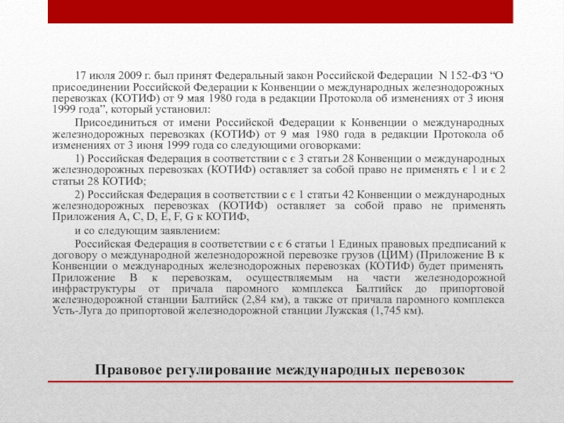 1) Российская Федерация в соответствии с є 3 статьи 28 Конвенции о международных железнодорожных перевозках (КОТИФ) оставляет за собой право не применять є 1 и є 2 статьи 28 КОТИФ;