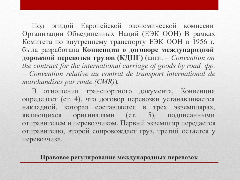 ООН в 1956 г. была разработана Конвенция о договоре международной дорожной перевозки грузов (КДПГ) (англ. – Convention on the contract for the international carriage of goods by road, фр. – Convention relative au contrat de transport international de marchandises par route (CMR)).