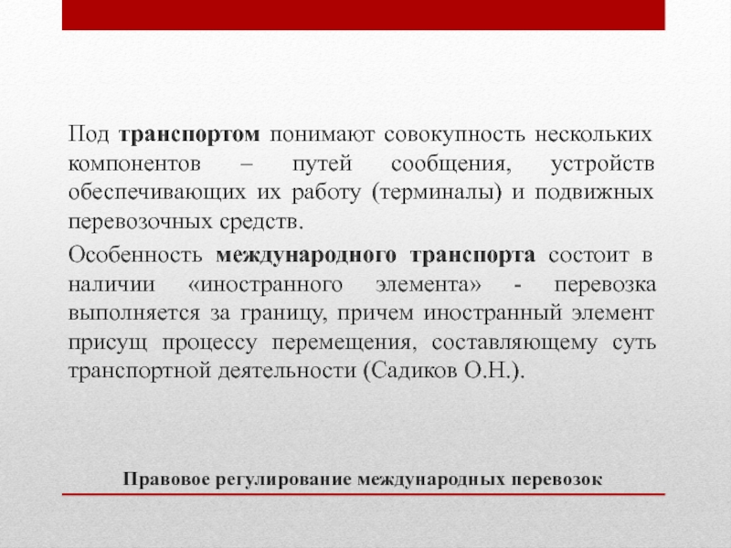Особенность международного транспорта состоит в наличии «иностранного элемента» - перевозка выполняется за границу, причем иностранный элемент присущ процессу перемещения, составляющему суть транспортной деятельности (Садиков О.Н.).