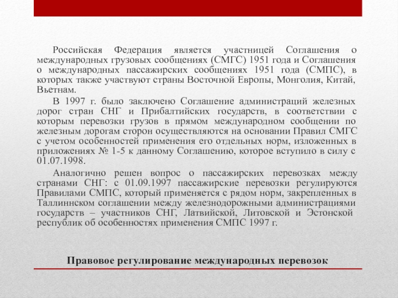 грузовых сообщениях (СМГС) 1951 года и Соглашения о международных пассажирских