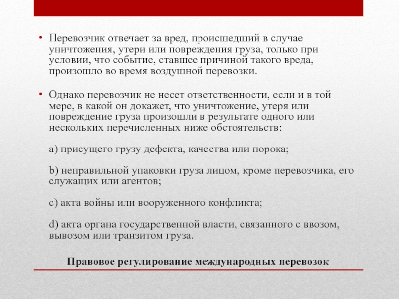 За повреждение или утрату зарегистрированного багажа, также как и за просрочку в его доставке перевозчик несет ответственность во всех случаях, если не докажет, что данный ущерб был вызван: виной самого пассажира; в силу указаний, данных пассажиром; характером багажа; обстоятельствами непреодолимой силы; рисками, связанными с ненадлежащей или отсутствующей упаковкой; особыми свойствами багажа; перевозкой в составе зарегистрированного багажа неразрешенных предметов.