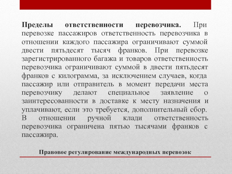 франков. При перевозке зарегистрированного багажа и товаров ответственность перевозчика ограничивают суммой в двести пятьдесят франков с килограмма, за исключением случаев, когда пассажир или отправитель в момент передачи места перевозчику делают специальное заявление о заинтересованности в доставке к месту назначения и уплачивают, если это требуется, дополнительный сбор. В отношении ручной клади ответственность перевозчика ограничена пятью тысячами франков с пассажира.