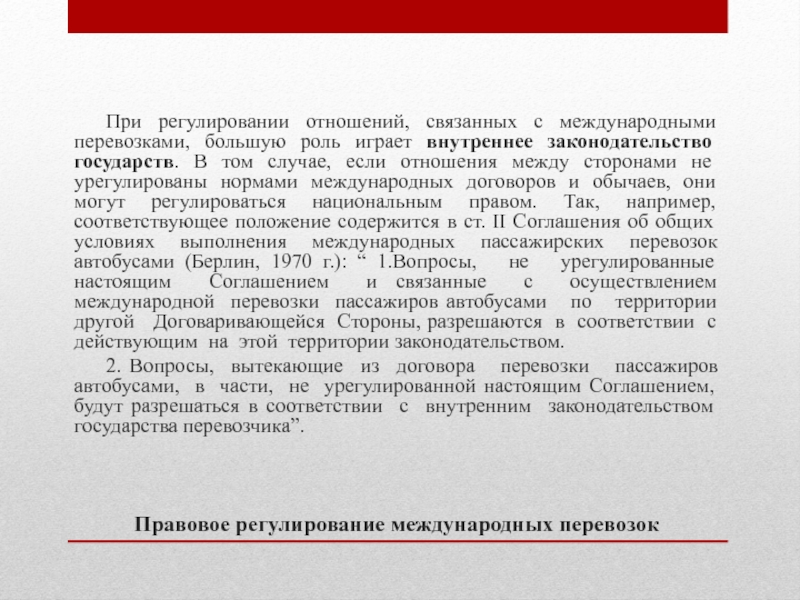 отношения между сторонами не урегулированы нормами международных договоров и обычаев, они могут регулироваться национальным правом. Так, например, соответствующее положение содержится в ст. II Соглашения об общих условиях выполнения международных пассажирских перевозок автобусами (Берлин, 1970 г.): “ 1.Вопросы, не урегулированные настоящим Соглашением и связанные с осуществлением международной перевозки пассажиров автобусами по территории другой Договаривающейся Стороны, разрешаются в соответствии с действующим на этой территории законодательством.