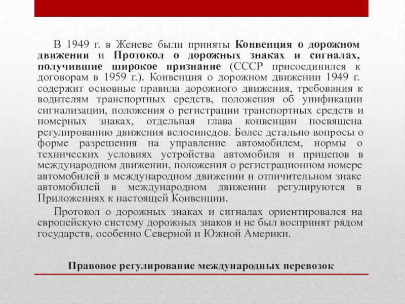 сигналах, получившие широкое признание (СССР присоединился к договорам в 1959 г.). Конвенция о дорожном движении 1949 г. содержит основные правила дорожного движения, требования к водителям транспортных средств, положения об унификации сигнализации, положения о регистрации транспортных средств и номерных знаках, отдельная глава конвенции посвящена регулированию движения велосипедов. Более детально вопросы о форме разрешения на управление автомобилем, нормы о технических условиях устройства автомобиля и прицепов в международном движении, положения о регистрационном номере автомобилей в международном движении и отличительном знаке автомобилей в международном движении регулируются в Приложениях к настоящей Конвенции.