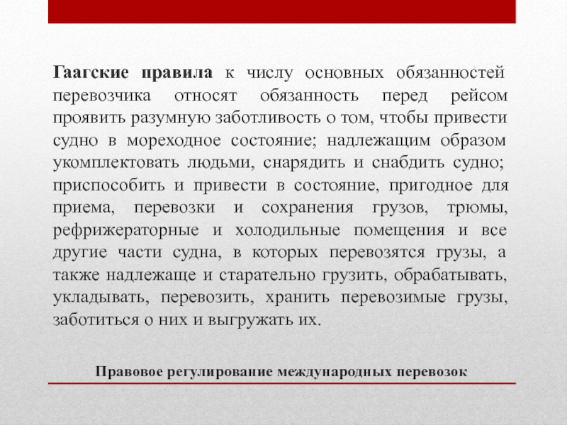 привести судно в мореходное состояние; надлежащим образом укомплектовать людьми, снарядить и снабдить судно; приспособить и привести в состояние, пригодное для приема, перевозки и сохранения грузов, трюмы, рефрижераторные и холодильные помещения и все другие части судна, в которых перевозятся грузы, а также надлежаще и старательно грузить, обрабатывать, укладывать, перевозить, хранить перевозимые грузы, заботиться о них и выгружать их.