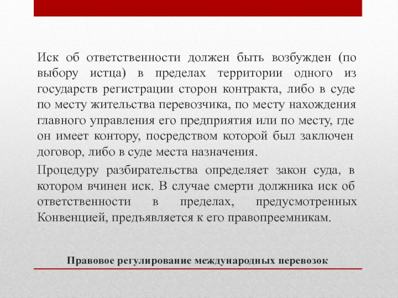 Процедуру разбирательства определяет закон суда, в котором вчинен иск. В случае смерти должника иск об ответственности в пределах, предусмотренных Конвенцией, предъявляется к его правопреемникам.