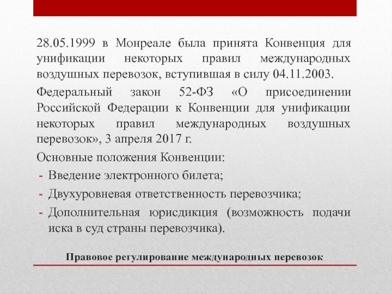 Федеральный закон 52-ФЗ «О присоединении Российской Федерации к Конвенции для унификации некоторых правил международных воздушных перевозок», 3 апреля 2017 г.