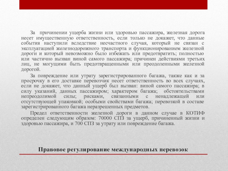 Предел ответственности железной дороги в данном случае в КОТИФ определен следующим образом: 70000 СПЗ за ущерб, причиненный жизни и здоровью пассажира, и 700 СПЗ за утрату или повреждение багажа.