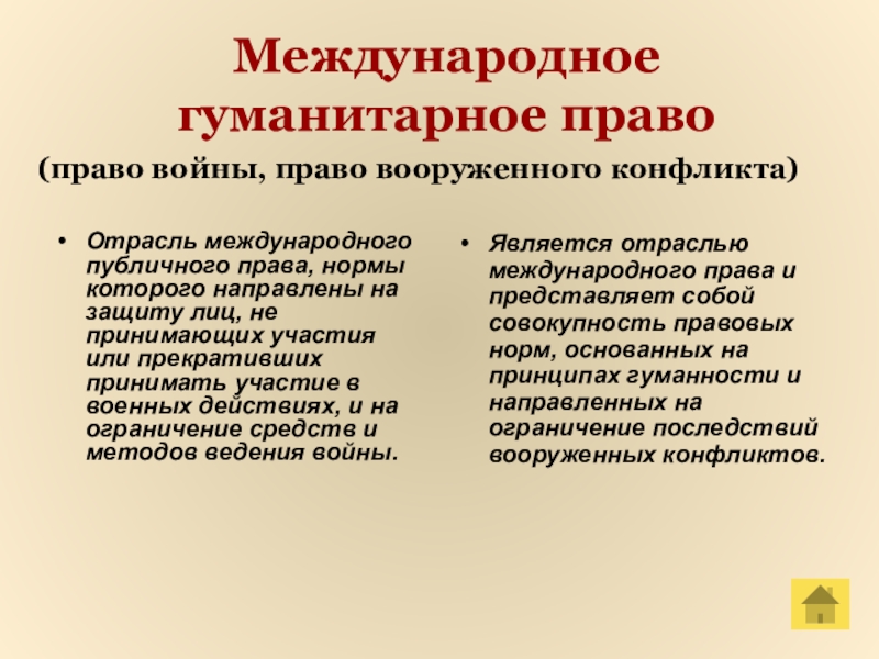 Является отраслью международного права и представляет собой совокупность правовых норм, основанных на принципах гуманности и направленных на ограничение последствий вооруженных конфликтов.