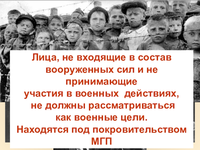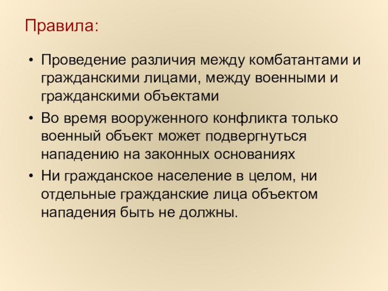 Слайд 19Проведение различия между комбатантами и гражданскими лицами, между военными и