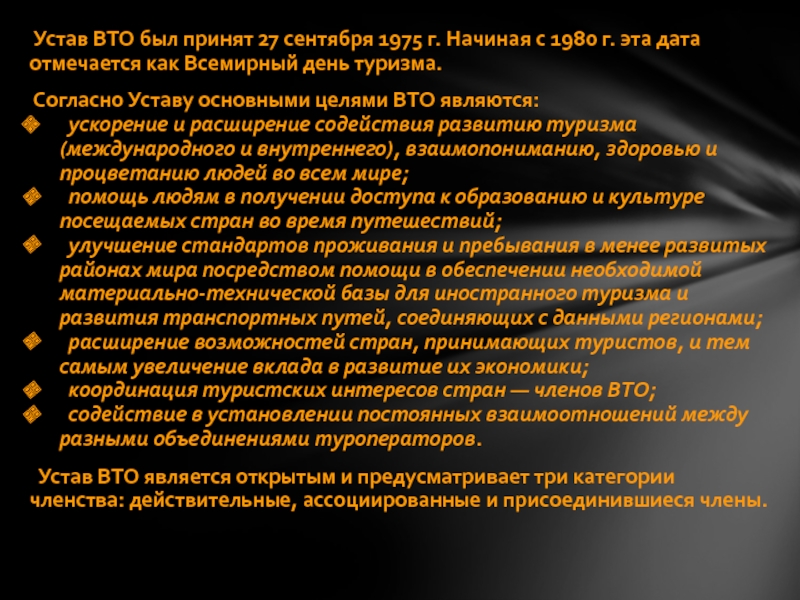 членов, несколько ассоциированных и свыше 150 присоединившихся членов (турфирмы, авиакомпании, международные организации и др.).История создания ВТО начинается с 1925 г., когда Лига наций сделала первую попытку дать официальное определение понятия «турист». Долгие годы организация официально называлась Международным союзом официальных туристских организаций и не входила в систему специализированных органов ООН. По инициативе Экономического и социального совета ООН (ЭКОСОС) 2 января 1975 г. ВТО получила официальный статус специализированного органа ООН и свое нынешнее наименование.