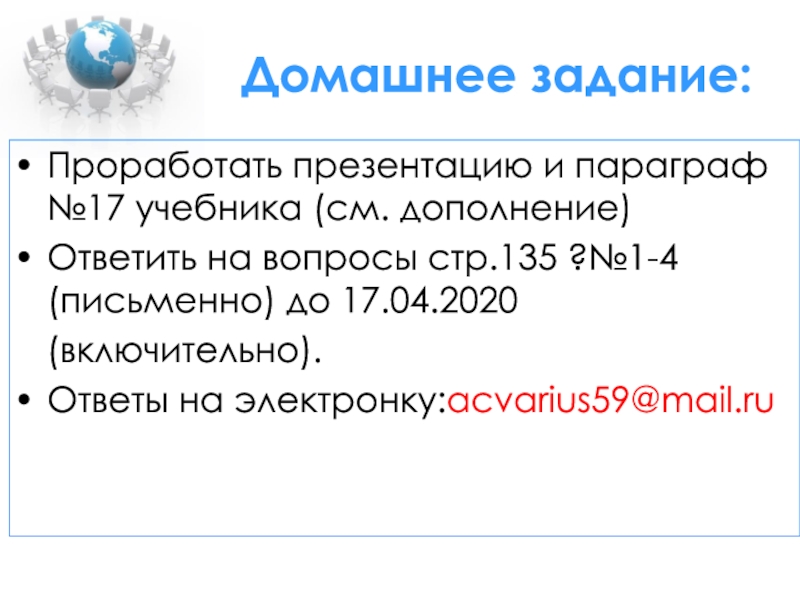 Домашнее задание:Проработать презентацию и параграф №17 учебника (см. дополнение)Ответить на вопросы стр.135 ?№1-4 (письменно) до 17.04.2020