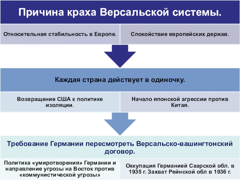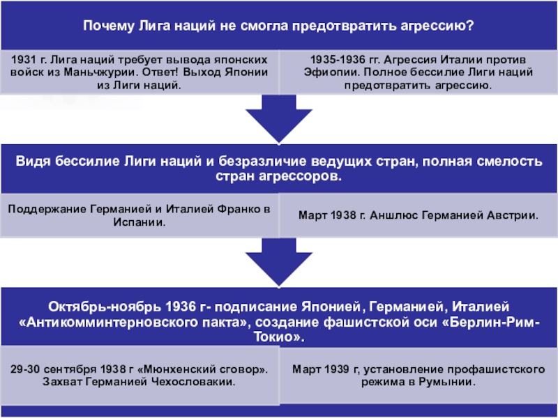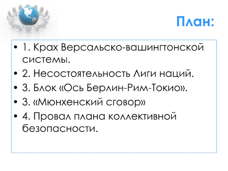 План:1. Крах Версальско-вашингтонской системы.2. Несостоятельность Лиги наций.3. Блок «Ось Берлин-Рим-Токио».3. «Мюнхенский сговор»4. Провал плана коллективной безопасности.