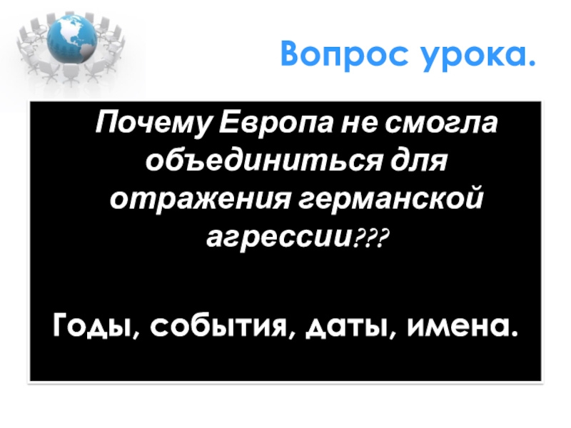 Вопрос урока.Почему Европа не смогла объединиться для отражения германской агрессии???Годы, события, даты, имена.