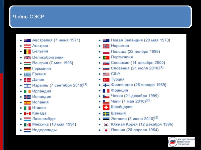 Слайд 18Организа́ция экономи́ческого сотрудничества и разви́тия (сокр. ОЭСР, Organisation for Economic Co-operation and