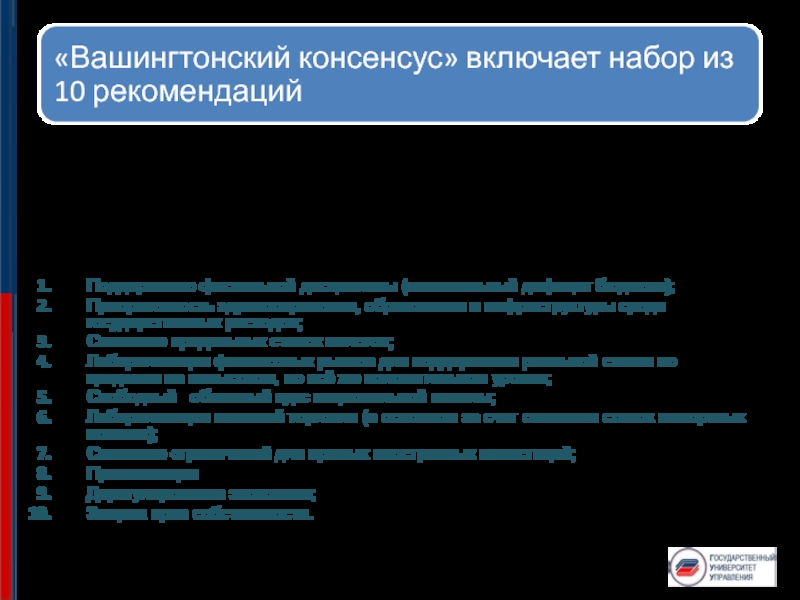 Отражали общую позицию администрации США, главных международных финансовых организаций — МВФ и Всемирного банка, а также ведущих американских аналитических центров. Их штаб-квартиры находились в Вашингтоне — отсюда и термин «Вашингтонский консенсус».
