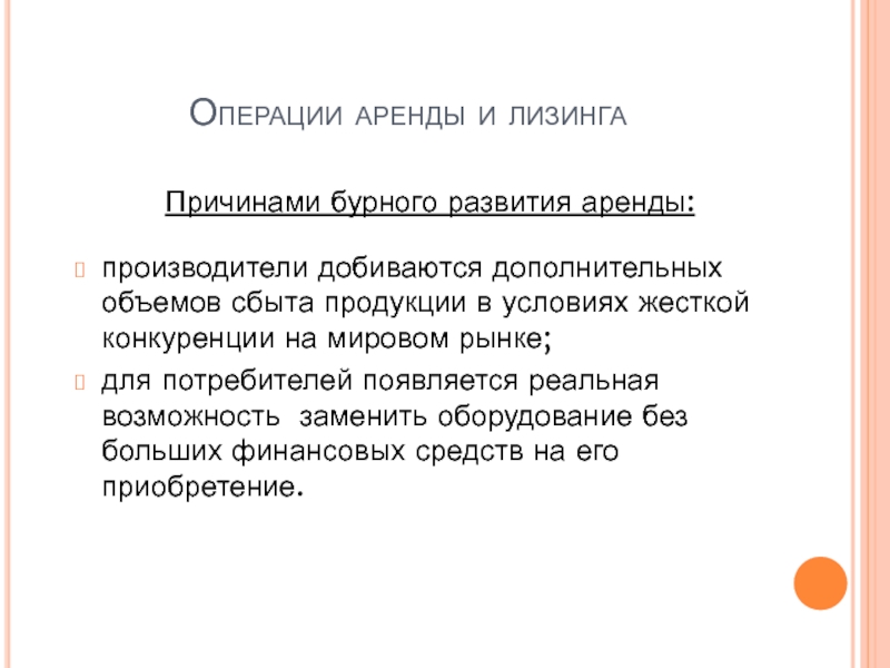 Операции аренды и лизингаПричинами бурного развития аренды:производители добиваются дополнительных объемов сбыта продукции в условиях жесткой конкуренции на мировом рынке; для потребителей появляется реальная возможность заменить оборудование без больших финансовых средств на