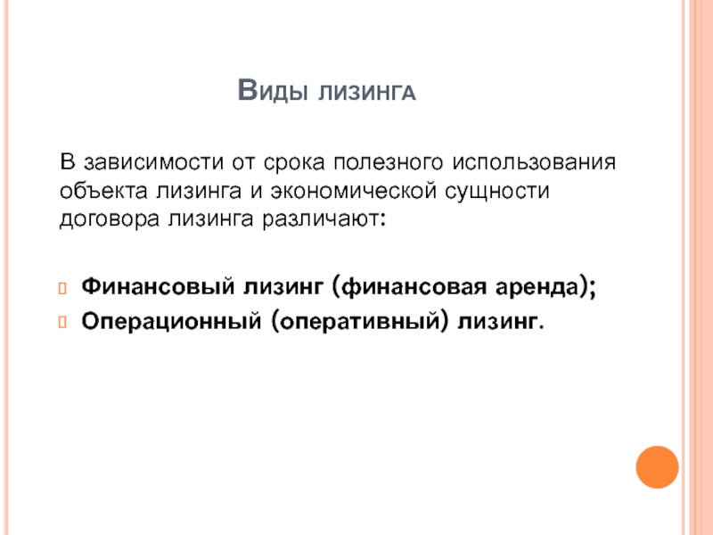 Виды лизингаВ зависимости от срока полезного использования объекта лизинга и экономической сущности договора лизинга различают:Финансовый лизинг (финансовая аренда);Операционный