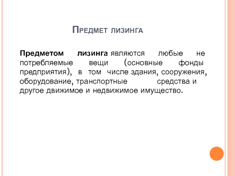 Предмет лизингаПредметом лизинга являются любые не потребляемые вещи (основные фонды предприятия), в том числе здания, сооружения,оборудование, транспортные средства и другое движимое и недвижимое имущество.