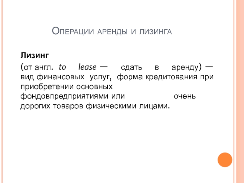 Операции аренды и лизингаЛизинг (от англ.  to lease — сдать в аренду) — вид финансовых услуг, форма кредитования при приобретении основных фондовпредприятиями или очень дорогих товаров физическими лицами.