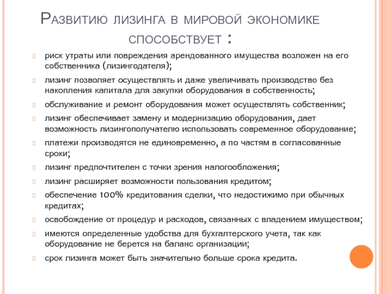Развитию лизинга в мировой экономике способствует :риск утраты или повреждения арендованного имущества возложен на его собственника (лизингодателя);лизинг