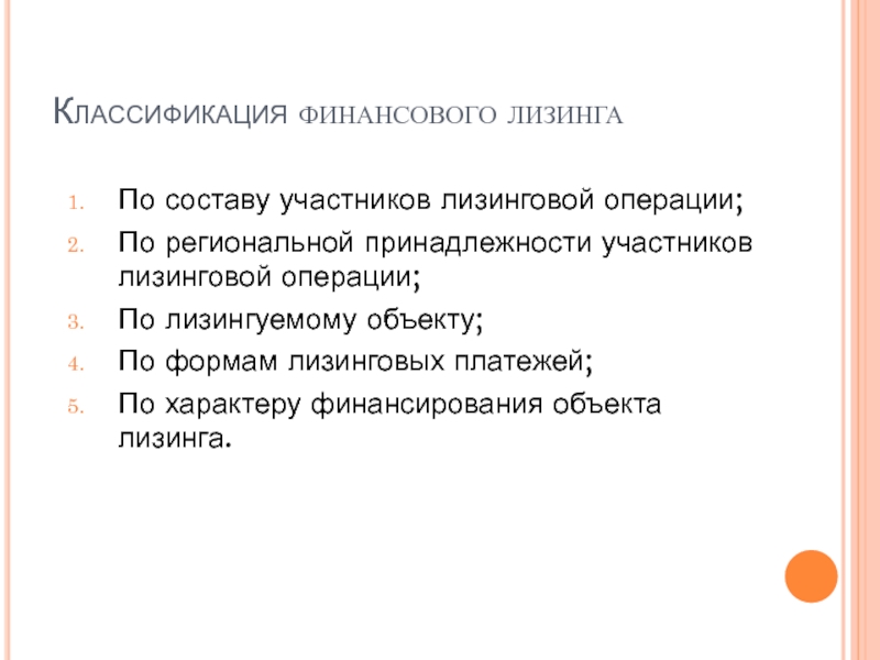 Классификация финансового лизингаПо составу участников лизинговой операции;По региональной принадлежности участников лизинговой операции;По лизингуемому объекту;По формам лизинговых платежей;По