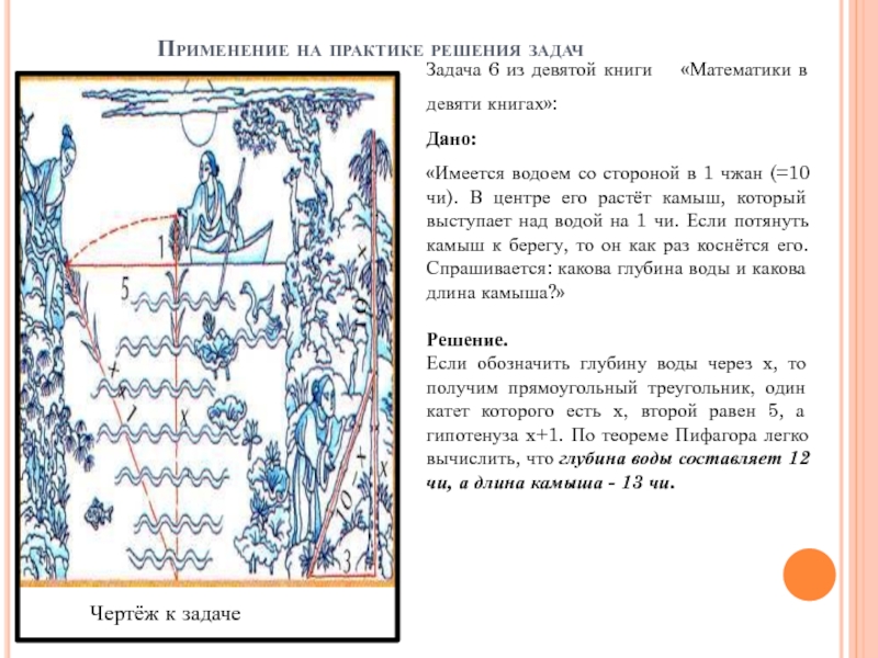центре его растёт камыш, который выступает над водой на 1 чи. Если потянуть камыш к берегу, то он как раз коснётся его. Спрашивается: какова глубина воды и какова длина камыша?»