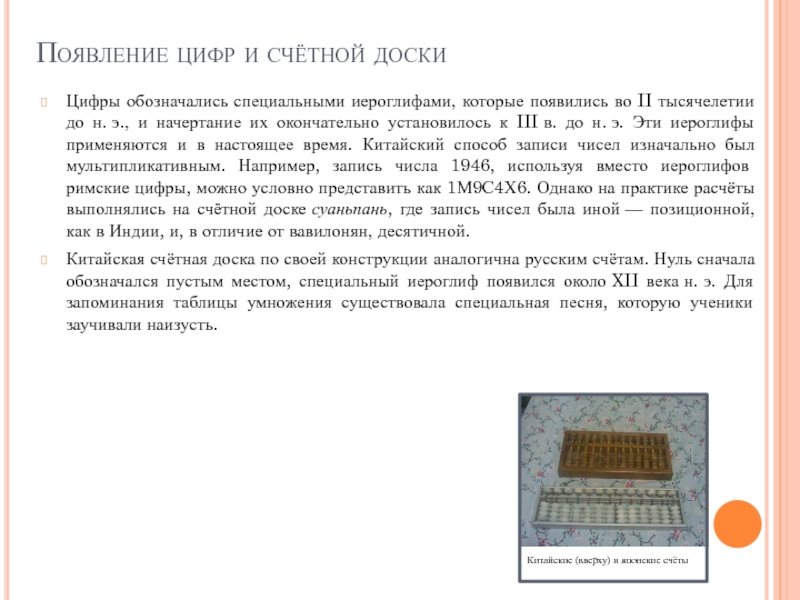 Китайская счётная доска по своей конструкции аналогична русским счётам. Нуль сначала обозначался пустым местом, специальный иероглиф появился около XII века н. э. Для запоминания таблицы умножения существовала специальная песня, которую ученики заучивали наизусть.