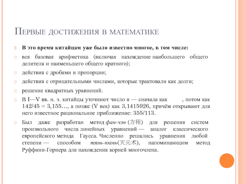 В I—V вв. н. э. китайцы уточняют число π — сначала как , потом как 142/45 = 3,155…, а позже (V век) как 3,1415926, причём открывают для него известное рациональное приближение: 355/113.