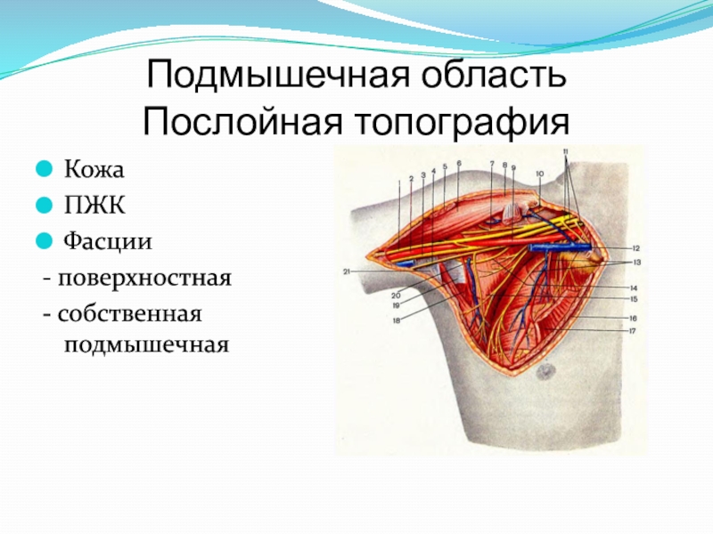 Подмышечная область Послойная топографияКожаПЖКФасции - поверхностная- собственная подмышечная