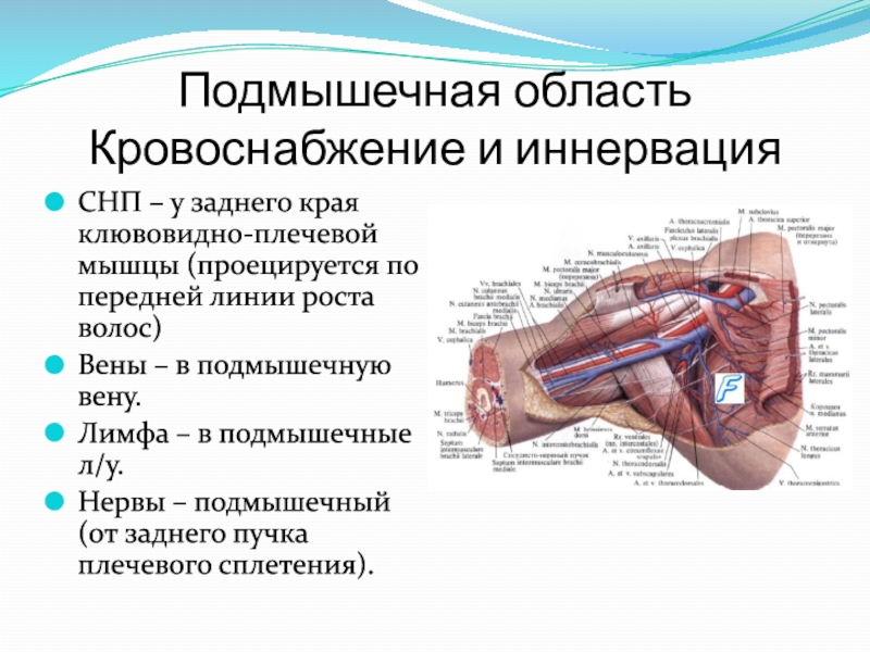 Слайд 11Подмышечная область Кровоснабжение и иннервация