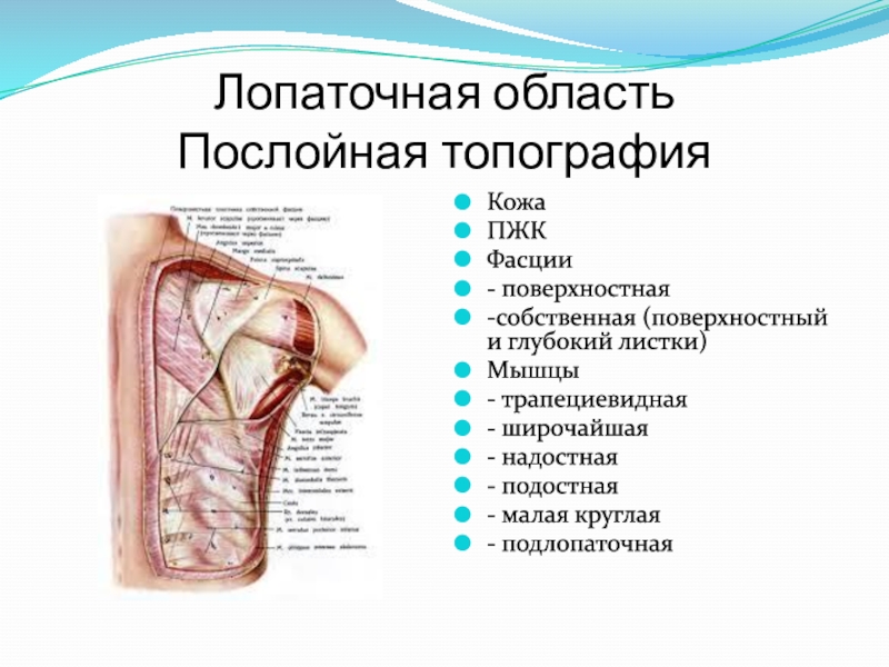 Лопаточная область Послойная топографияКожаПЖКФасции- поверхностная-собственная (поверхностный и глубокий листки)Мышцы- трапециевидная- широчайшая- надостная- подостная- малая круглая- подлопаточная