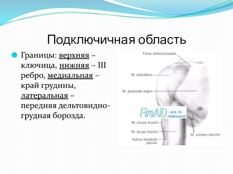 Подключичная областьГраницы: верхняя – ключица, нижняя – III ребро, медиальная – край грудины, латеральная – передняя дельтовидно-грудная