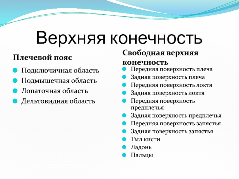 Верхняя конечностьПлечевой поясСвободная верхняя конечностьПодключичная областьПодмышечная областьЛопаточная областьДельтовидная областьПередняя поверхность плечаЗадняя поверхность плечаПередняя поверхность локтяЗадняя поверхность локтяПередняя