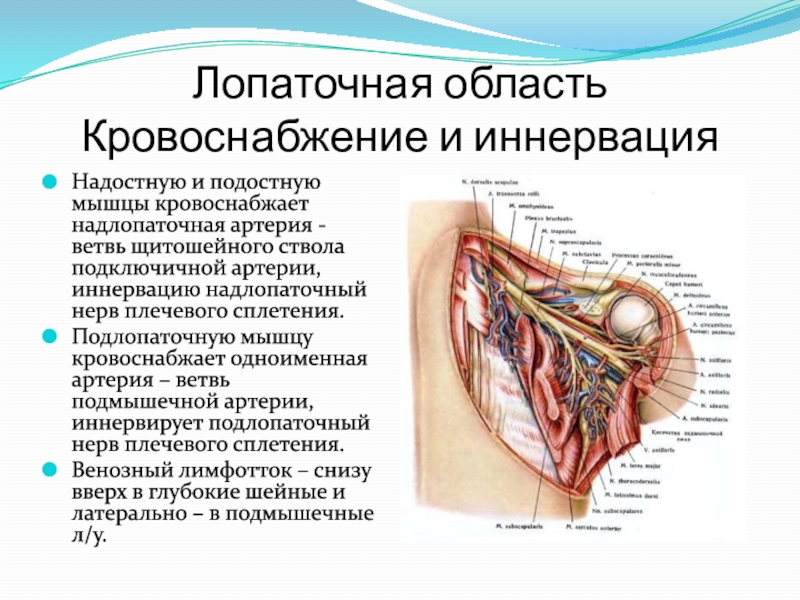 Лопаточная область Кровоснабжение и иннервацияНадостную и подостную мышцы кровоснабжает надлопаточная артерия - ветвь щитошейного ствола подключичной артерии,