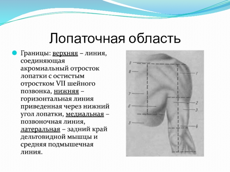 Лопаточная областьГраницы: верхняя – линия, соединяющая акромиальный отросток лопатки с остистым отростком VII шейного позвонка, нижняя –
