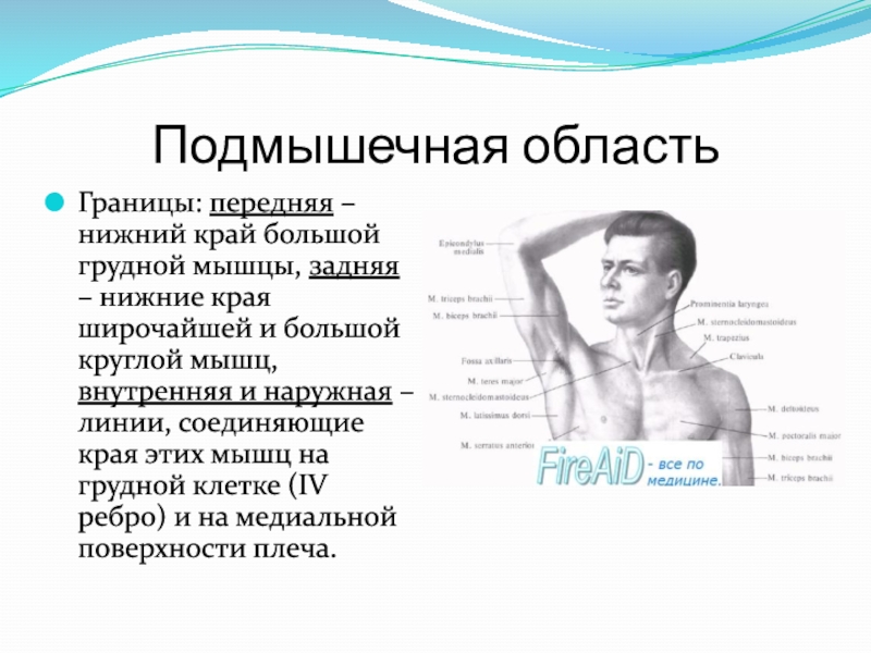 Подмышечная областьГраницы: передняя – нижний край большой грудной мышцы, задняя – нижние края широчайшей и большой круглой