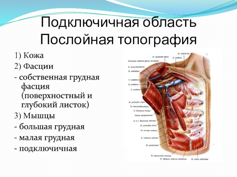 Подключичная область Послойная топография1) Кожа2) Фасции - собственная грудная фасция (поверхностный и глубокий листок)3) Мышцы - большая