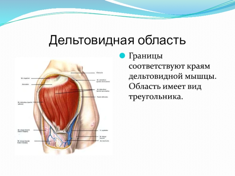 Дельтовидная областьГраницы соответствуют краям дельтовидной мышцы. Область имеет вид треугольника.