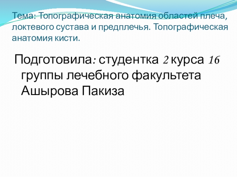 Тема: Топографическая анатомия областей плеча, локтевого сустава и предплечья. Топографическая анатомия кисти.Подготовила: студентка 2 курса 16 группы лечебного факультета Ашырова Пакиза