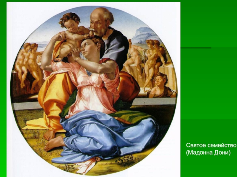 основном с двумя итальянскими городами — Флоренцией и Римом. По характеру своего дарования он был прежде всего скульптор. Это ощущается и в живописных работах мастера, необычайно богатых пластичностью движений, сложных поз, отчётливой и мощной лепкой объёмов. Во Флоренции Микеланджело создал бессмертный образец Высокого Возрождения — статую «Давид» (1501—1504), ставшую на многие века эталоном изображения человеческого тела, в Риме — скульптурную композицию «Пьета́» (1498—1499), одно из первых воплощений фигуры мёртвого человека в пластике. Однако наиболее грандиозные свои замыслы художник смог реализовать именно в живописи, где он выступил подлинным новатором цвета и формы.