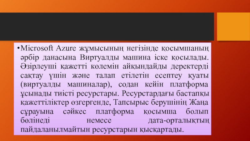 Слайд 5Microsoft Azure жұмысының негізінде қосымшаның әрбір данасына Виртуалды машина іске