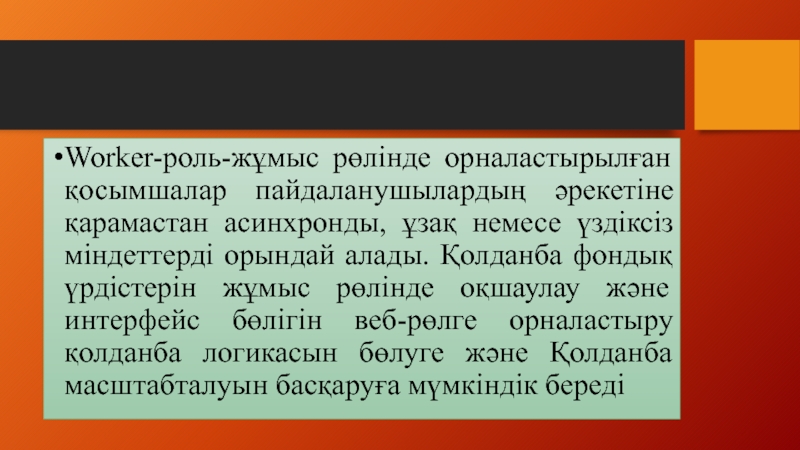 Слайд 12Worker-роль-жұмыс рөлінде орналастырылған қосымшалар пайдаланушылардың әрекетіне қарамастан асинхронды, ұзақ немесе